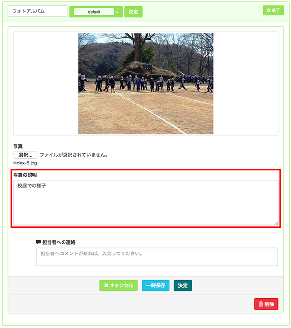 写真の詳細画面で、写真の変更や削除、写真の説明をいれたりできます。